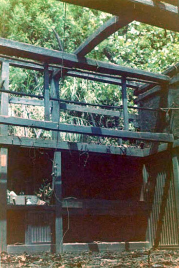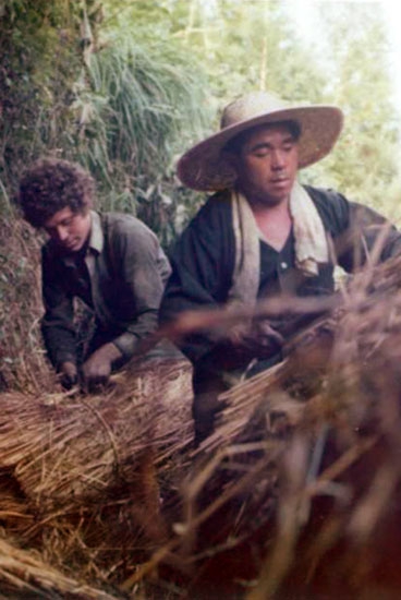The roof, having been only partially repaired with used thatch, began to deteriorate. Starting in 1980, Alex began collecting thatch, bamboo, and other materials, and in 1986, the roof underwent its second, and this time a full re-thatching and renovation. Kita Satoshi 喜多 聡 acted as contractor, and he and Omo-san together felled and carried to the house 99 cedar logs which they used to replace the rotted taruki (upper rafters). Later, other friends gathered to help Satoshi and Omo-san conduct the re-thatching, which was completed in spring 1986.