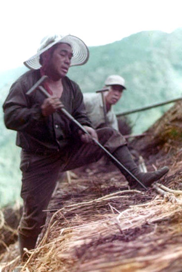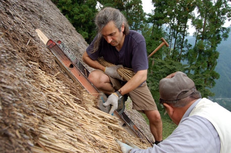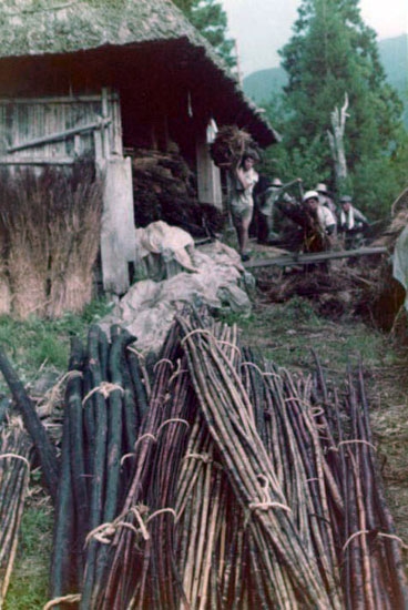 古い茅を使って修理したため、屋根は再び劣化しはじめました。1980年からアレックスは茅、竹、その他の材料を集め始め、今度は全体的な修理をすることにしました。喜多聡が中心になり、尾茂さんと一緒に、新しい垂木99本を切り出し家まで運びました。その後も村人たちや友人たちの助けを借りて作業を続け、1986年に総葺き替え替が完了しました。